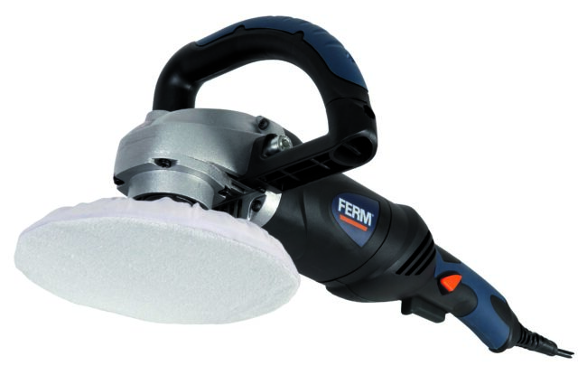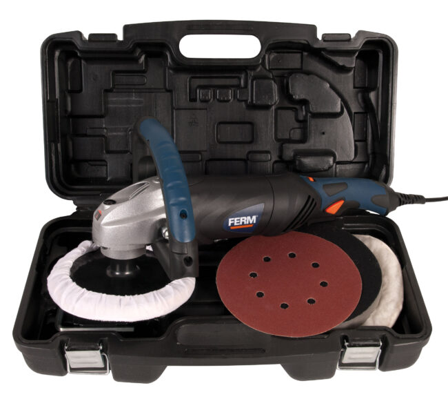 It has a Velcro system for quick and easy exchange of polishing pads and sanding sheets, a variable speed setting for optimal and precise machine control, an extra long power-cable, a LED Power indicator, and a polishing kit is included.